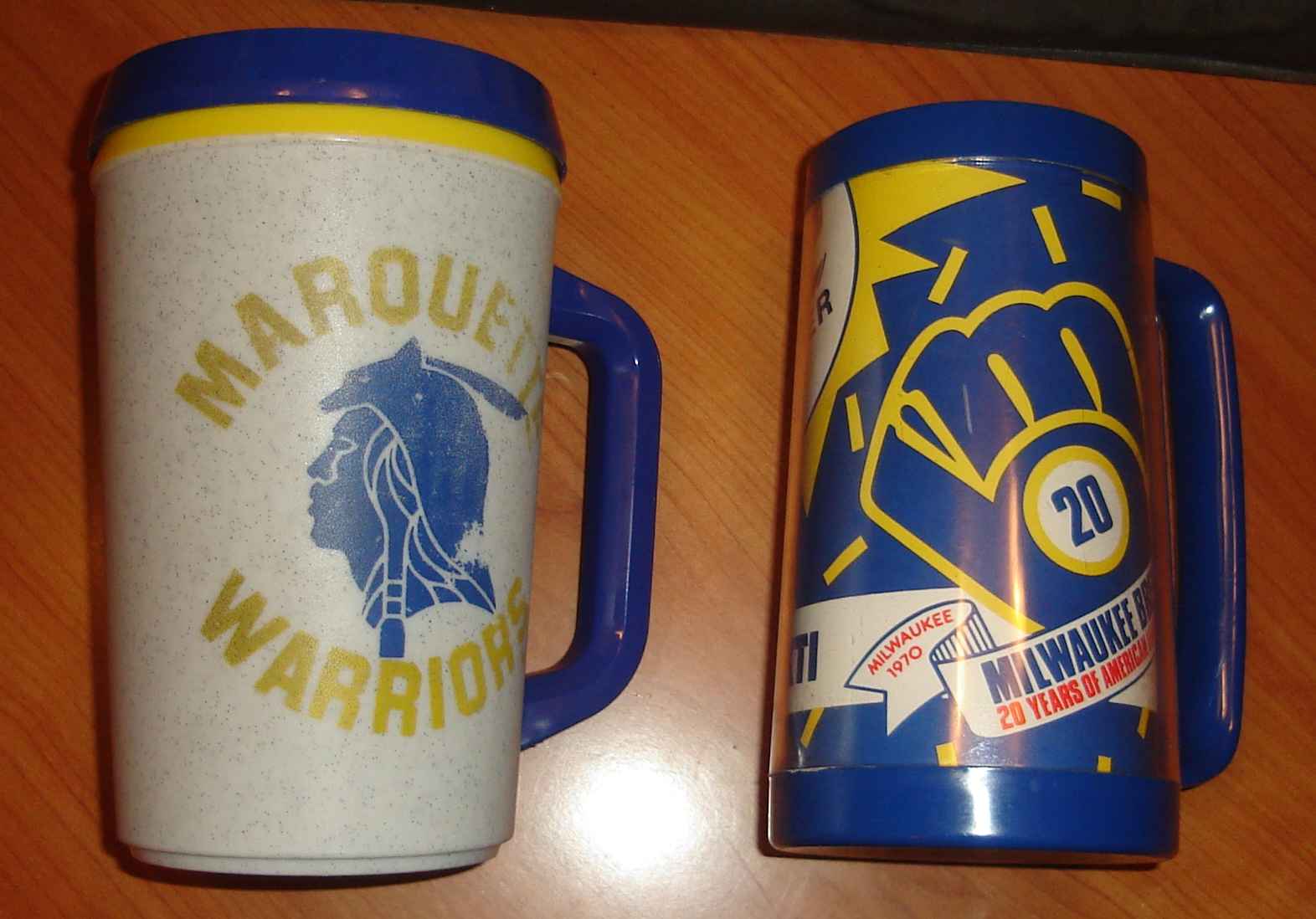 On the right, an insulated Milwaukee Brewers mug from the 20th season in 1989. I don’t remember if I went to the game. As a matter of fact, I’m not sure if I have any memories of this mug at all. I’m not sure how I came to own it. I might have palmed it as I left my father’s house after living there during college. Well, no, that’s not my style. Maybe I went to the game and have repressed it. I did go to a couple of games in that era at Milwaukee County Stadium when the Brew Crew was at the bottom of the American League.