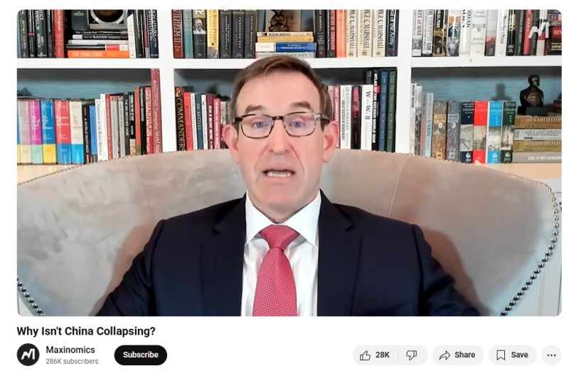 So I stumbled upon a YouTube video called Why Isn’t China Collapsing? (spoiler alert: the video does not actually offer an answer), and the podcaster vtuber Mr. Beast meets Zeihan knockoff host, erm, hosts an “expert” on China (I put quotation marks on it because I’m not sure anyone is an expert on anything these days–I mean, I’m not even an expert on napping, but I have studied it for hours a day for decades). And the expert has books behind him. Which I look at closely, of course, which is how I spend my time on Zoom meetings when I can. Which is not often, because young people on Zoom meetings these days have so few books.