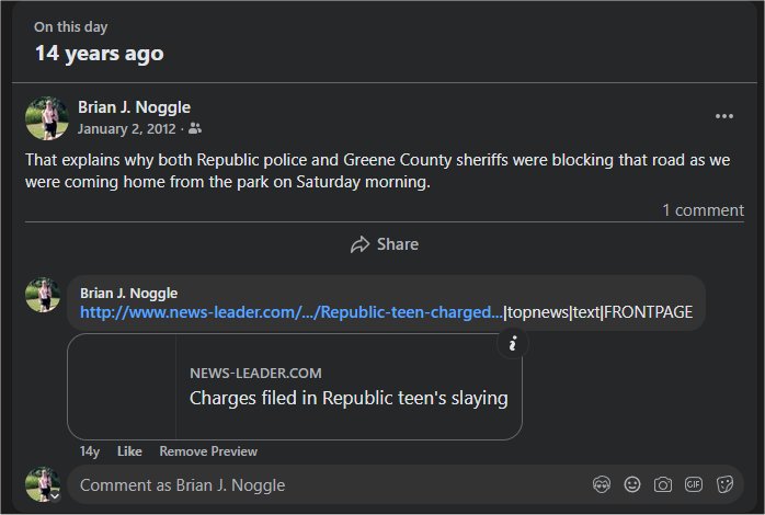 Man, right about that time, I was assuredly questioning the safety of my new home. In addition to passing that crime scene, right about the same time we had serial killers at church (who came to Nogglestead for dinner after the unfortunate instance of one of their victim’s dying); the coach of the little league team I also coached and my boys played on shot his wife and killed himself; and someone rang our bell at 4am because the stolen car they were driving broke down or something–he abandoned it and fled from the helpful deputy we summoned to try to help while I waited inside the house cradling a shotgun just in case.