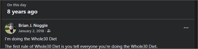 My beautiful wife and I are doing the Whole 30 again this year, which will be our third time through it. You know, it won’t really affect my intake much. I won’t cook bacon or breakfast sausage. I haven’t really eaten as many doughnuts as in the recent past. I won’t have the opportunity to throw in a frozen pizza or something else from the freezer for a quick lunch. I won’t be able to cook a can of beans as a handy side. I’ll not have my nightly portion of wine. I won’t be able to snack on tortilla chips in the evening, which is something I do, what, once a week? No melted cheese tortillas or ham and cheese on rye.