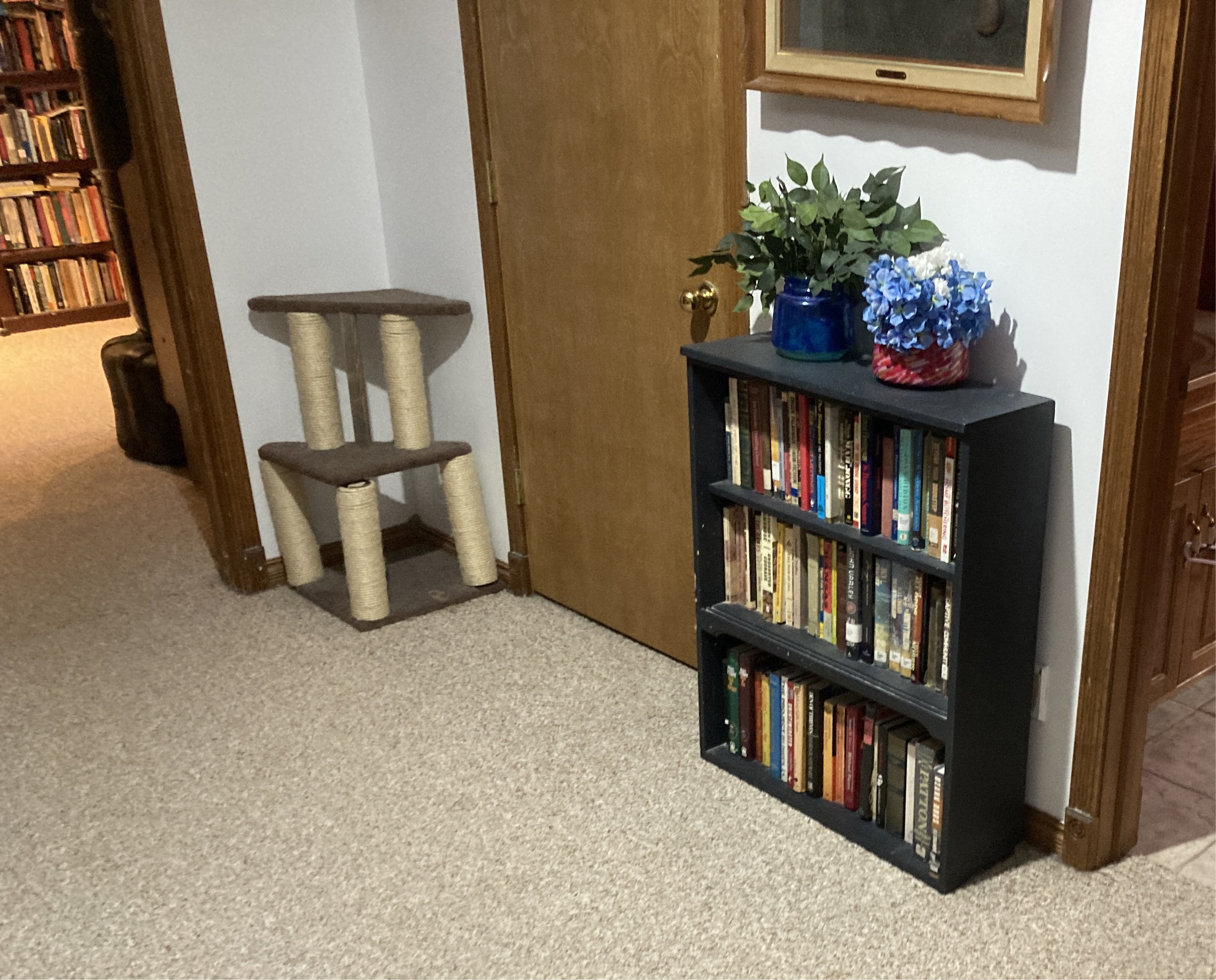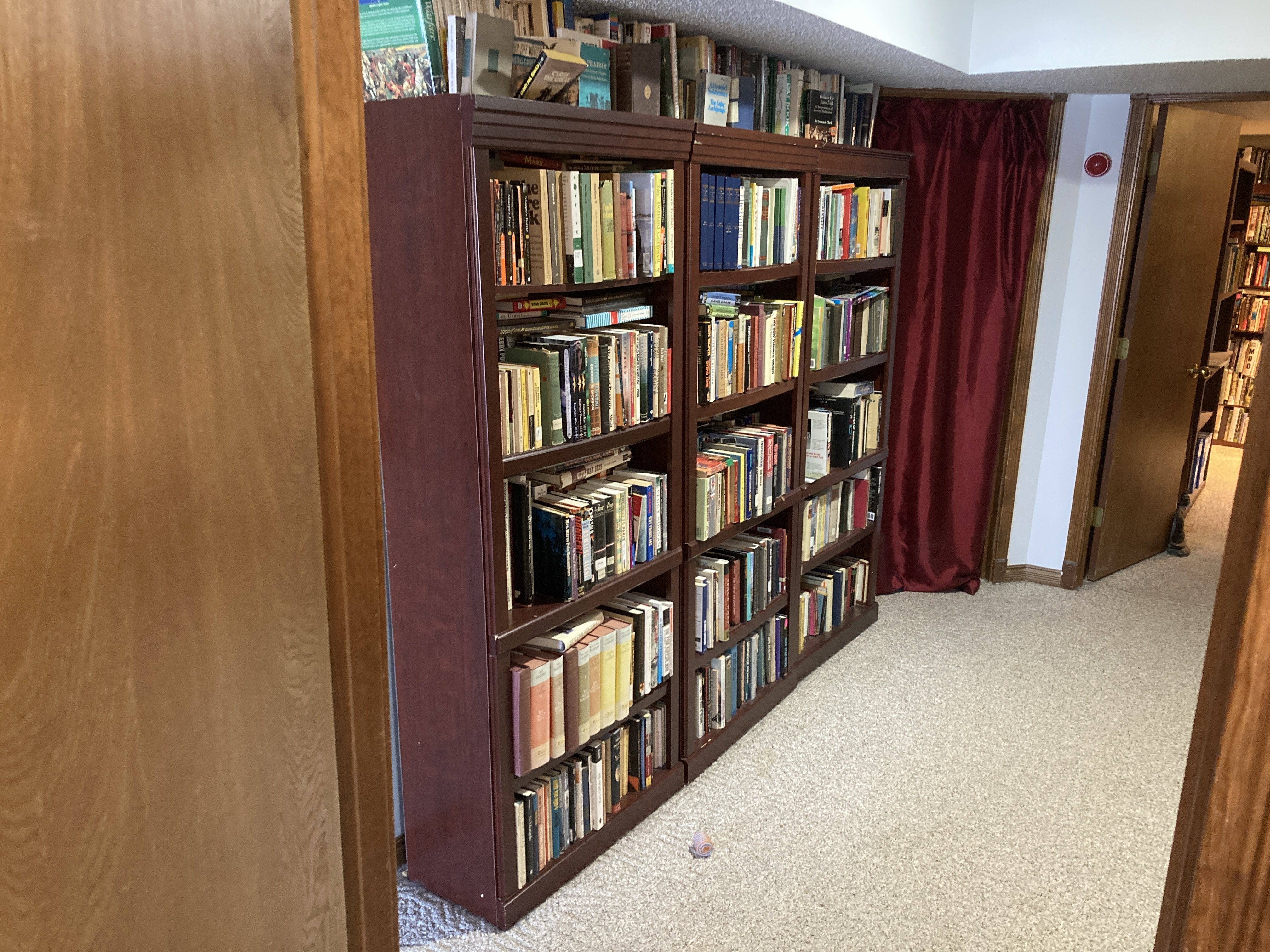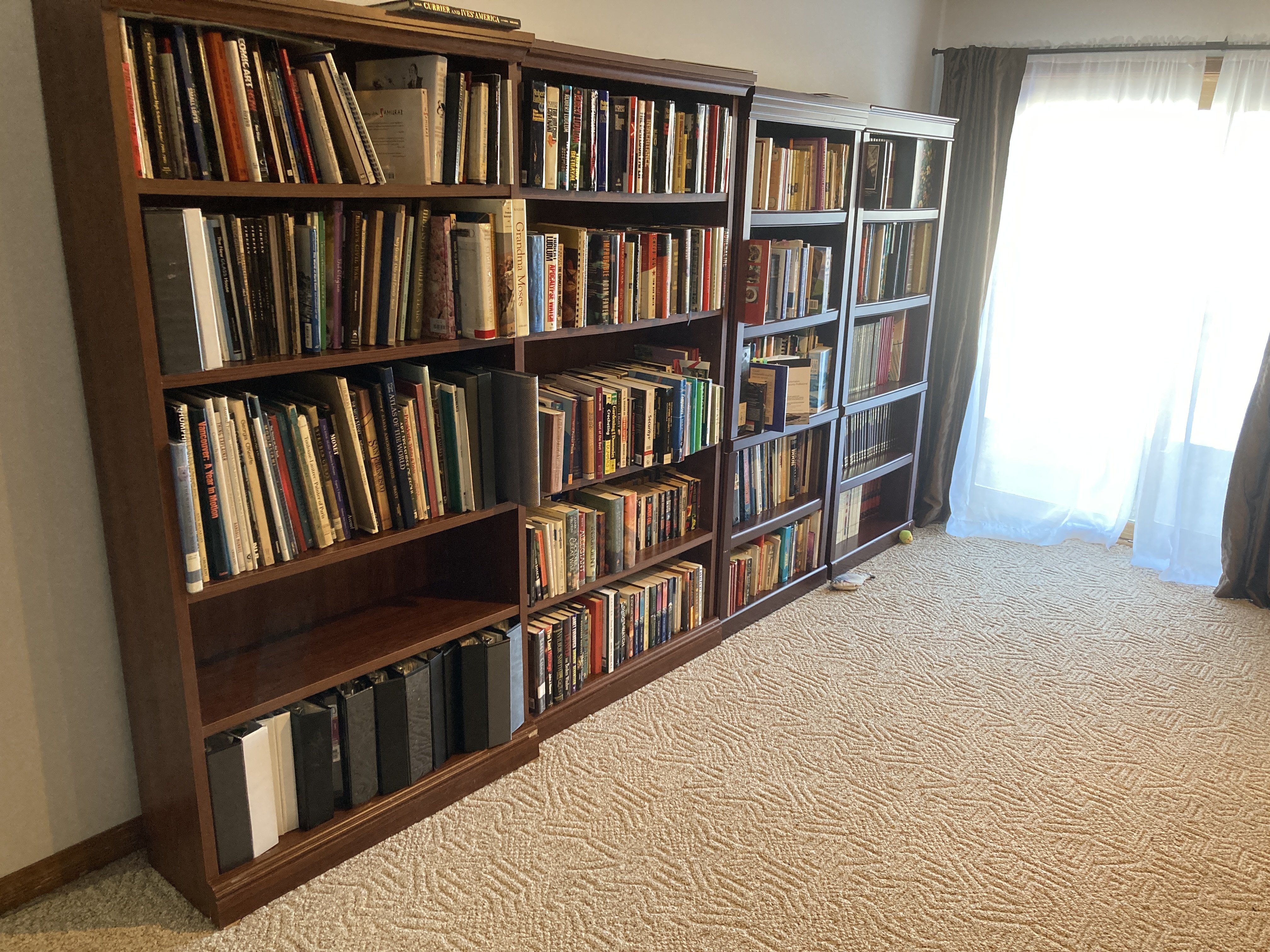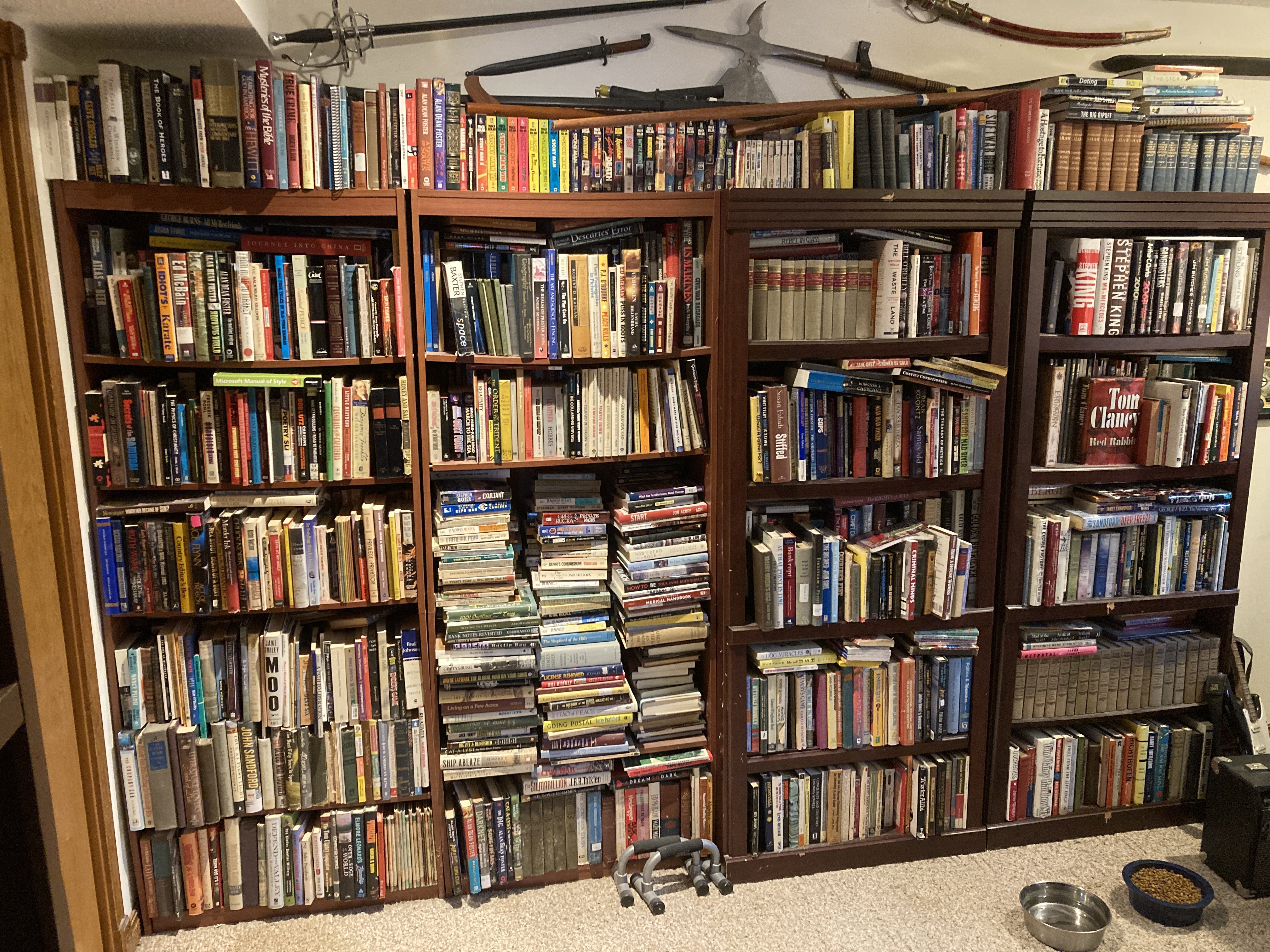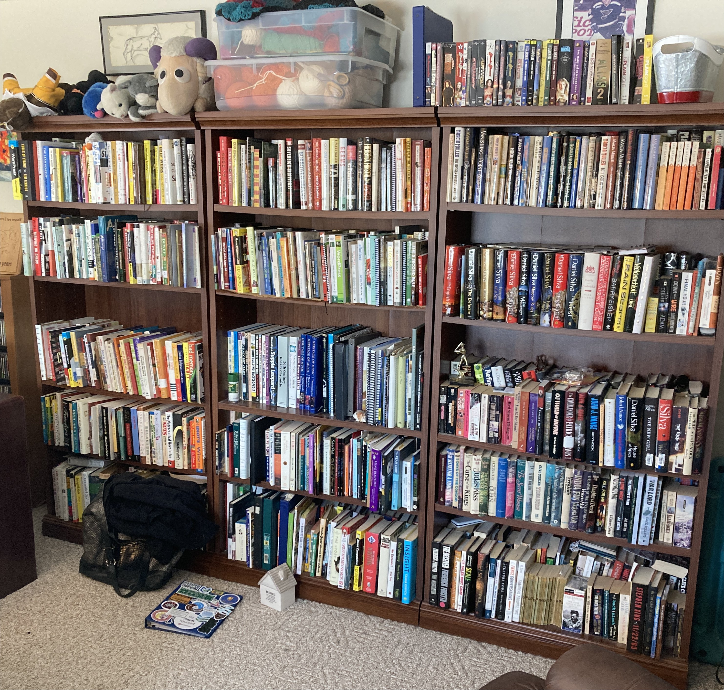 My wife moved one of the bookshelves from her office to the wall outside it so she could fit a chair into that space, but she still has three shelves with her books and some videos. I think she mixes books that she has read with books she has not, and somehow remembers what she has read. I suppose that’s easier to do when you’re reading 100+ books a year where much of it is interchangeable garbage. Sorry, pulp or midlist fiction.