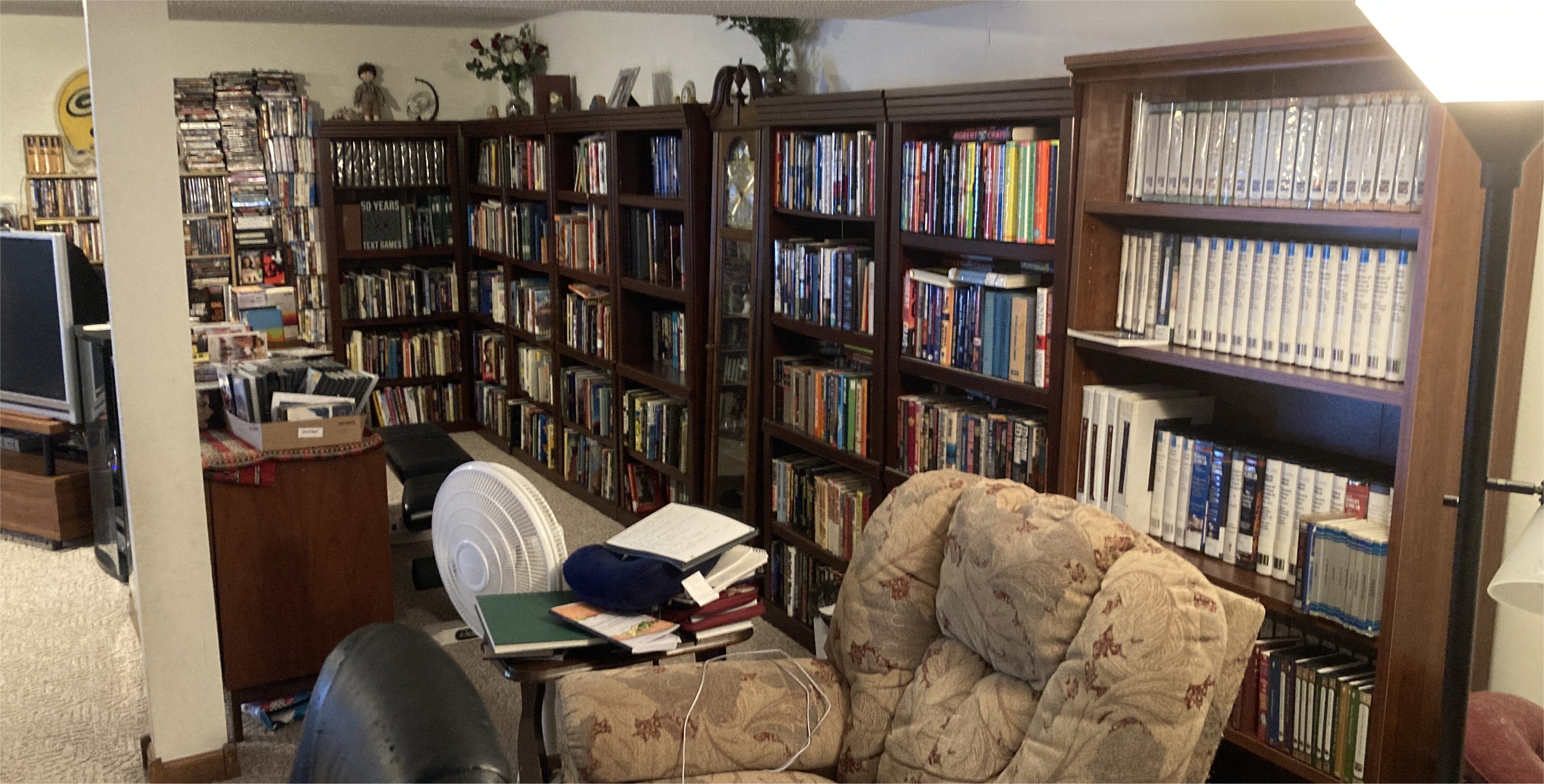 The far wall of the lower level from my reading chair includes the every-growing stacks of media in the video library (and the cabinets in the foreground show what I mean about the unwatched videos stacked atop cabinets). The single bookshelf on that wall contains an old set of classics from my grandfather which I wrapped in Mylar in 2021, an old set of science encyclopedias whose binding is quite deteriorated, some reference books, and now some overflow books-I’ve-read. The long wall contains the books which I have read, no longer neatly arranged as in 2010, but I do tend to keep the poetry books kind of together and the crime fiction authors like Bobby Crais, Ed McBain, etc., together. And the one set of shelves that is not double-stacked is my extensive Robert B. Parker collection. Which will sometime in the next decade be hidden behind read overflow.