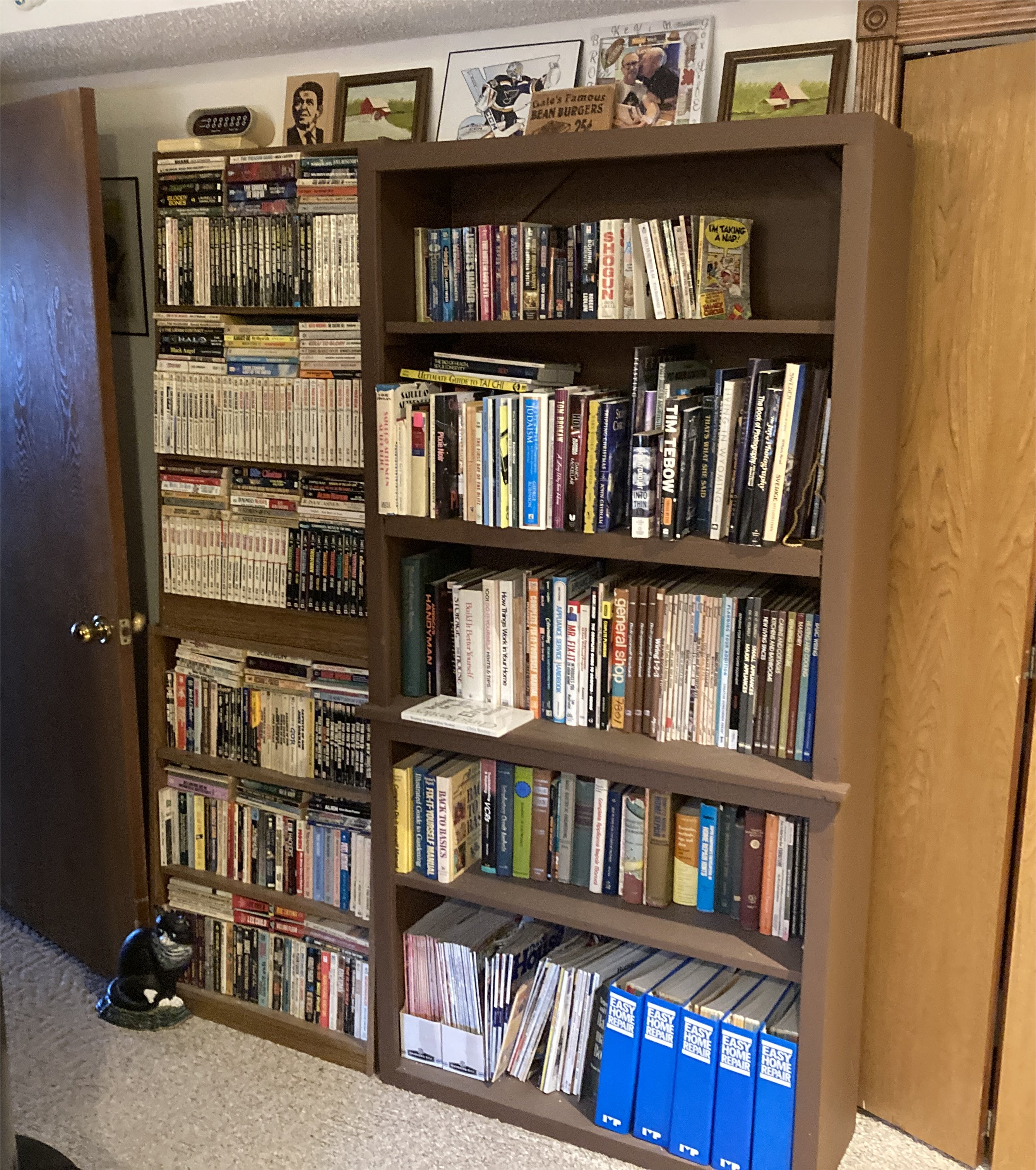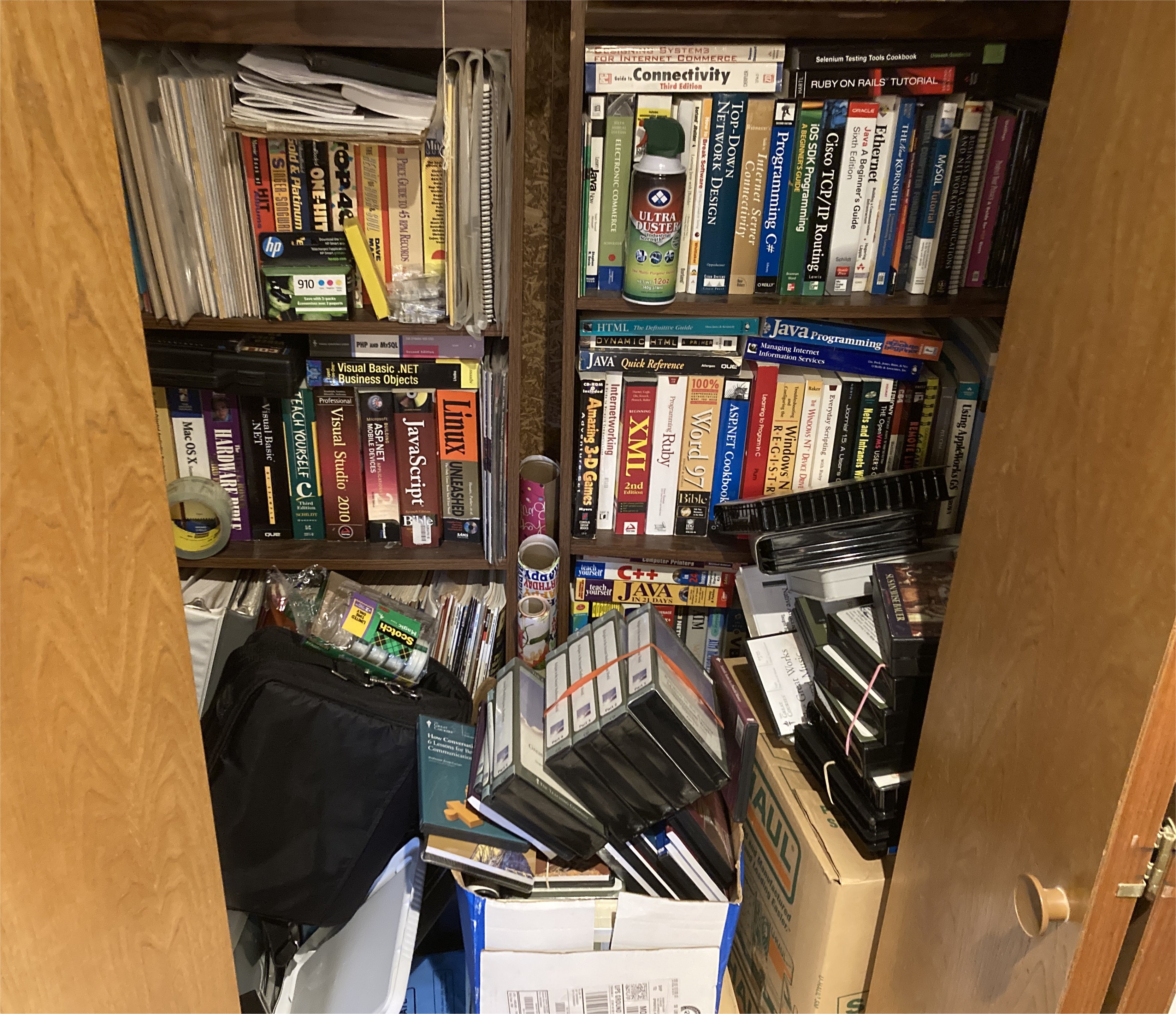The office closet contains a couple of bookshelves (depicted) with old tech books, collectible magazines, other magazines, and some binders of written material from high school and college friends.