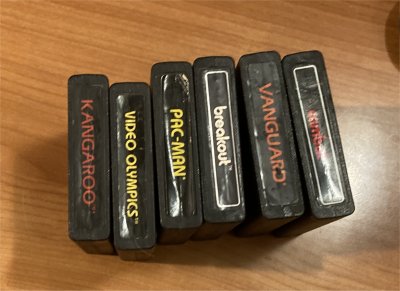 Well, until I had a little time yesterday afternoon, when I got off my duff and went into the storeroom. And laid my hands easily on the box containing our overflow Atari cartridges. So I got them out, dusted each one of them, and found the cartridge missing its label. As Vanguard starts with V, it was at the bottom, natch.