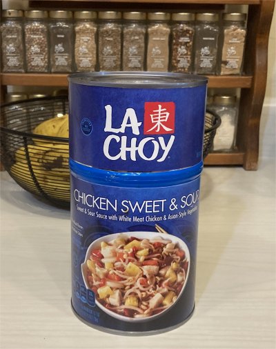 As my beautiful wife is traveling this week for business, I picked up a can (well, a package of two cans taped together). But instead of going with the chow mein, which is probably we got annually or twice every three years, I went with the sweet and sour chicken.