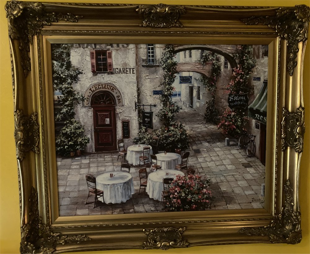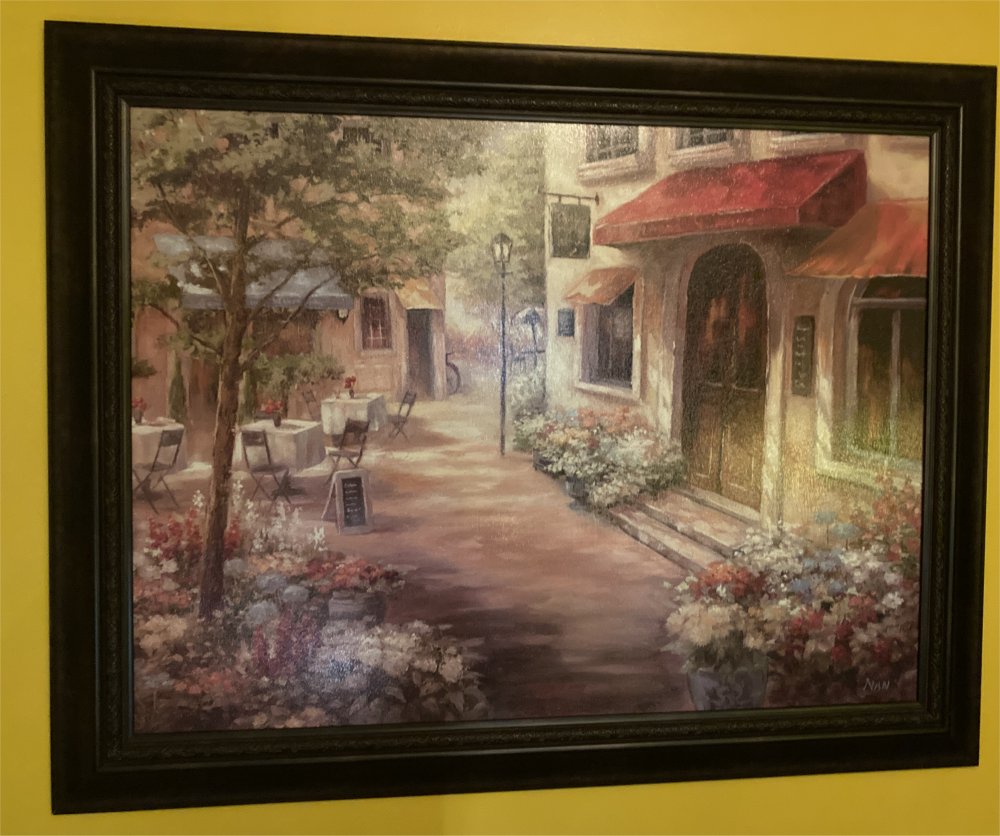 As you might know, gentle reader, for major pieces of wall art, I’ve favored prints of master works from, er, the masters, starting with three prints I bought in college on a fresh new credit card in 1990 (The Man with the Golden Helmet by Rembrandt, Christina’s World by Wyeth, and A Saturday Afternoon on the Island of La Grande Jatte by Seurat) which I got a deal on (3 for $18–and by the time we paid them off, in probably a decade later if we consider the money paid to the credit company first-in, first out, we probably paid $100 each for them including interest). Or personal relics which were gifts and/or inherited from family members now likely departed. My beautiful wife, however, favors consumer art which is mass-produced art of a topical theme, whether it’s the mere decorative squares and textures, Mediterranean landscapes, or Mediterranean cafes.