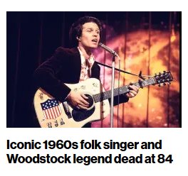 “Neil Sedaka dies” (and for or five news items about it), and “Iconic Folk Singer and Woodstock Legend dead at 84”: