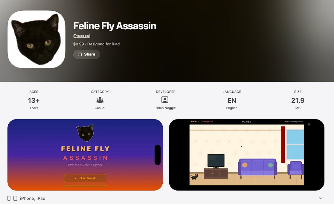 At any rate, if you have an iPad or iPhone, it’s under a buck here. It’s rated 13+ because of the cartoonish violence in it–a cartoon cat swatting a cartoon fly. I called that cartoonish violence in the age ratings wizard because I didn’t want to end up in the Hague because some Austrian toddler saw that and started torturing flies like he saw in the game. Where the flies are NOT tortured; they’re merely swatted.