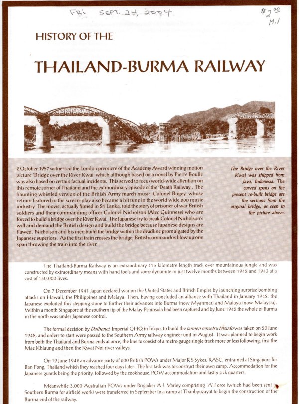 And I could place when the previous owner visited the site because the book and a paper pamphlet included at no cost to me both say Sept 24 2004 on them. The included paper is not part of the book, and it’s too big for a Found Bookmark post, but I read it as well. It’s entitled “History of the Thailand-Burma Railway”.