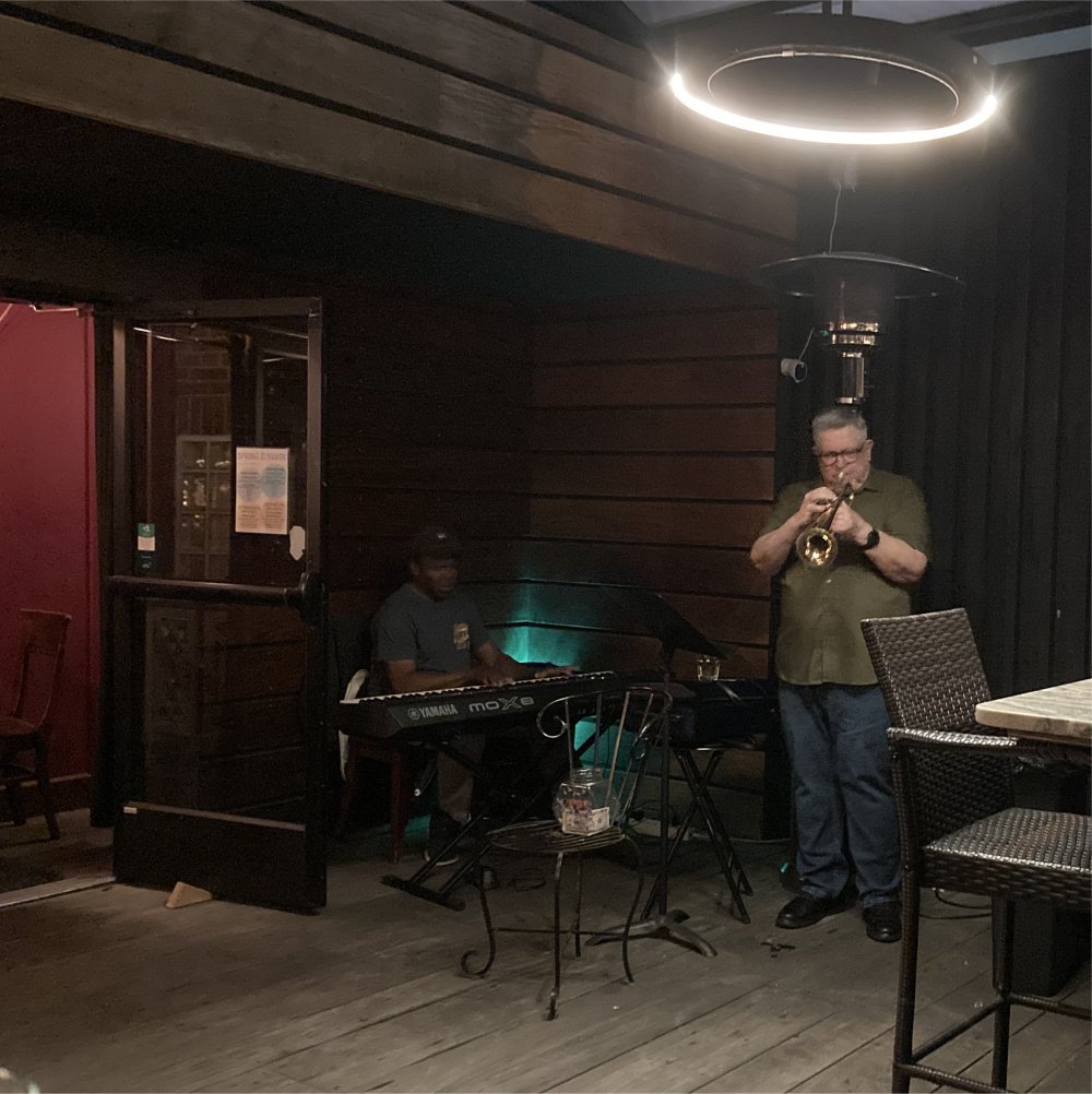 We took a rideshare from another Tech Week event to Clayton, arriving two hours early, and we told the waitress we were in no hurry as we were there for Jim Manley. So we had a leisurely dinner, and our server told us she’d reserved one of her tables where he would play. Sasha’s is a charming little shop, a jumble of rooms carved out of two buildings on Demun, and Manley played in a barroom with, I guess, a retractable roof, which came in handy. His first set started at 8:30.